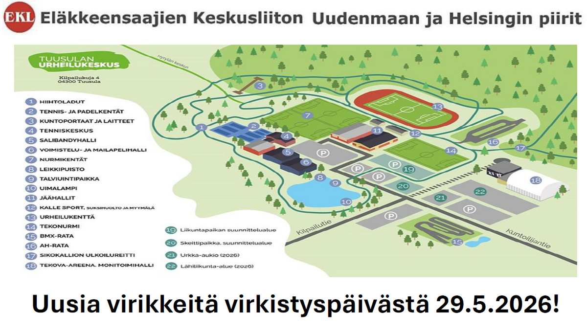 Tule viettämään virkistävä päivä monipuolisen lii kunnan ja yhdessäolon merkeissä Tuusulan Urhei lukeskukseen. Tarjolla myös mahdollisuus tutustua Tuusulan kulttuuritarjontaan.